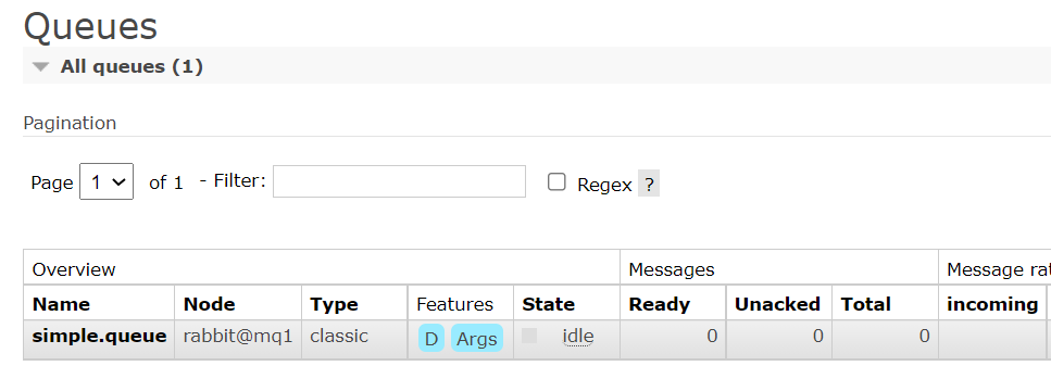 | 准确模式exactly | 队列的副本量count | 集群中队列副本(主服务器和镜像服务器之和)的数量。count如果为1意味着单个副本:即队列主节点。count值为2表示2个副本:1个队列主和1个队列镜像。换句话说:count = 镜像数量 + 1。如果群集中的节点数少于count,则该队列将镜像到所有节点。如果有集群总数大于count+1,并且包含镜像的节点出现故障,则将在另一个节点上创建一个新的镜像。 |