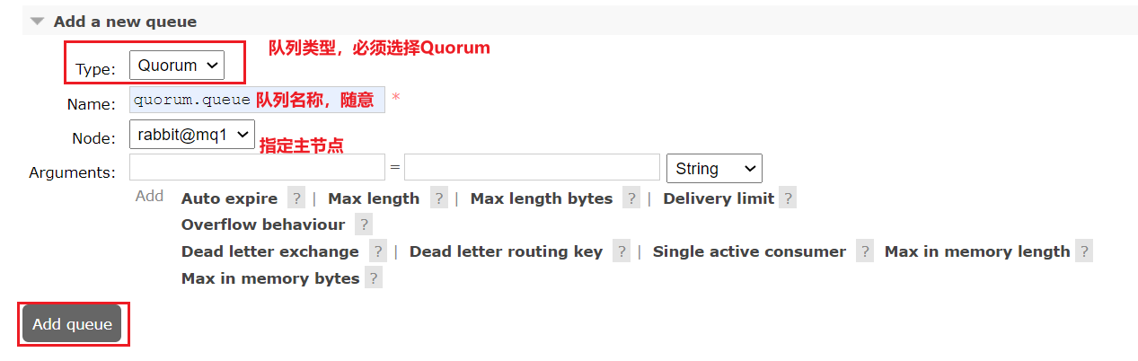 | nodes | node names | 指定队列创建到哪些节点,如果指定的节点全部不存在,则会出现异常。如果指定的节点在集群中存在,但是暂时不可用,会创建节点到当前客户端连接到的节点。 |